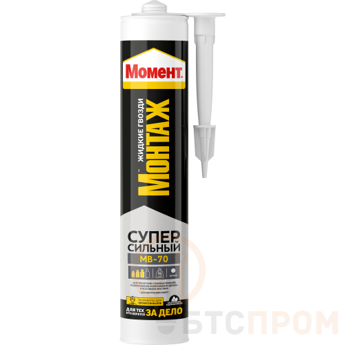 Является высококачественным клеем, разработанным специально для склеивания широкого спектра тяжелых конструкций внутри помещения. Клей МОНТАЖ суперсильный Момент 697133 используется, когда необходимо прочное склеивание. Подходит как для внутренних, так и наружных работ, заполняет трещины до 1 см. Данный клей не содержит растворителей и не имеет запаха. Хранить его необходимо при температуре не ниже 0 ?С. Соединяемые поверхности должны быть обезжиренными, и одна из них должна впитывать клей. Склеивание осуществляется при температуре от 10 ?С, в течение 15 минут. Не подходит для склеивания полиэтилена, полипропилена, тефлона и аналогичных материалов. Склеиваемые материалы: стиропор, дерево, металл, ПВХ, керамика, ДСП, гипсокартон, пробка, пенополистирол, гипс. Срок годности - 18 месяцев. Первоначальная сила схватывания — 70 кг/м2.