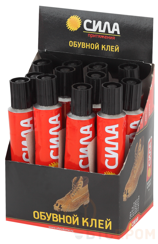 Применяется при изготовлении и ремонте обуви, быстро и качественно склеивает обувные материалы в различных сочетаниях: кожу, кожзаменитель, резину, термоэластопласт, пластик, поливинилхлорид, войлок, ткани, пробковое дерево и др. Удлиненный носик облегчает процесс нанесения клея. В шоу-боксе 12 тюбиков.