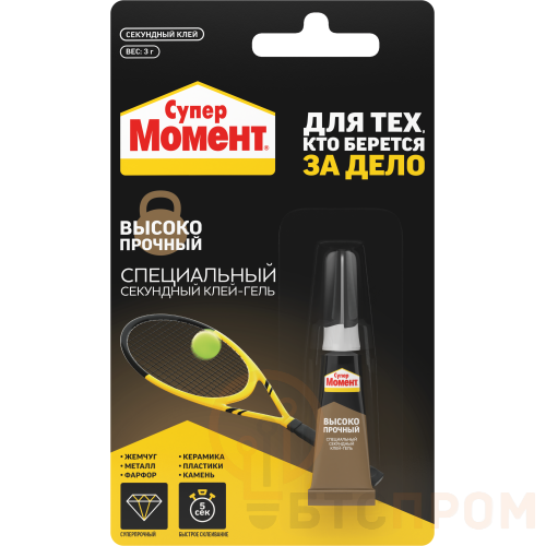Супер Момент Высокопрочный является универсальным секундным клеем в форме геля, отлично подходит для соединения различных материалов. Водостойкий и термостойкий, обладает повышенной прочнойстю клеевого шва. Быстрый, прозрачный, не растекается. Универсальный надежный секундный клей, отличающийся повышенной прочностью и надежностью шва. <ul> <li>Сверхпрочный</li> <li>Без запаха</li> <li>Мгновенное склеивание</li> <li>Образует сверхпрочное соединение, устойчивое к вибрационным и ударным нагрузкам</li> </ul>