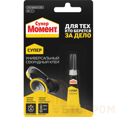 Супер клей Момент 874565 используют для быстрого склеивания таких материалов, как фарфор, керамика, дерево, кожа, резина, металл, пробка, картон и большинство пластиков. В составе данного клея - смола эпоксидная. Склеивание осуществляется всего за 5 секунд. Благодаря прозрачному составу место склеивания совсем незаметно. сверхпрочный клеевой шов выдерживает нагрузку до 200 кг на см2. Хранить необходимо в сухом месте при температуре от -20 ?С до +30 ?С. Поставляется на блистер-карте. Срок годности - 24 месяца.