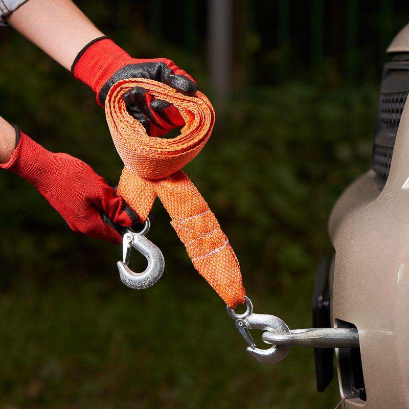 Буксировочный трос предназначен для надежного соединения двух автомобилей с целью безопасной транспортировки или буксировки одного автомобиля с помощью другого. Является незаменимым элементом в случае поломки автомобиля. Трос изготовлен из полипропилена, отличающегося стойкостью к низким температурам и резкому изменению влажности. На концах изделия расположены металлические крюки с пружинным фиксатором. Трос обладает грузоподъемностью до 2,5 тонн и при продолжительной эксплуатации не меняет свои линейные размеры. Длина изделия – 5 м, что обеспечивает достаточное расстояние между автомобилями, позволяет водителям сохранять безопасную дистанцию и маневрировать во время движения. Для удобства хранения трос поставляется в индивидуальной упаковке.