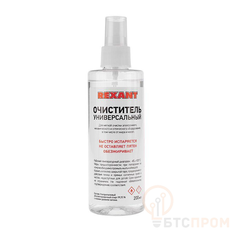 Очиститель универсальный 200 мл (с распылителем) REXANT предназначен для «мягкой» очистки или обезжиривания различных предметов. Применяется для очистки радиоэлектронных элементов (печатные платы, контакты реле и прочие), очистки оптического оборудования (линзы стекла, объективы), бытовых нужд (чистка зеркал, оконных стекол, хрусталя; как жидкое топливо в спиртовках и зажигалках; растопка древесного угля), в автомобильном деле (очистка и удаление влаги из бензобака автомобиля, антизамораживатель стеклоомывающей жидкости при минусовых температурах), при монтаже и обслуживании волоконно-оптических кабелей (ВОЛС), обслуживания аудио– и видеооборудования и других целей. Представляет собой бесцветную прозрачную жидкость без механических примесей с характерным запахом. Очиститель является хорошим растворителем для различных эфирных масел, при промывке высокотехнологичных узлов и агрегатов, как обезжиривающее средство. Он быстро испаряется, не оставляя пятен на металлических или стеклянных поверхностях. Для быстрого и удобного нанесения флакон оборудован распылителем. Основные характеристики: Состав: абсолютированный изопропиловый спирт 99,7% Запах: спиртовой Объем: 200 мл