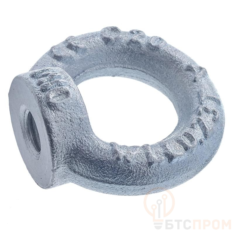 Рым-гайка DIN 582 визуально представляет собой кольцо с небольшой литой, круглой площадкой снизу. По центру площадки имеется отверстие с нарезанной резьбой определенного диаметра. Применяется в основном для перемещения грузов или для построения растяжек.