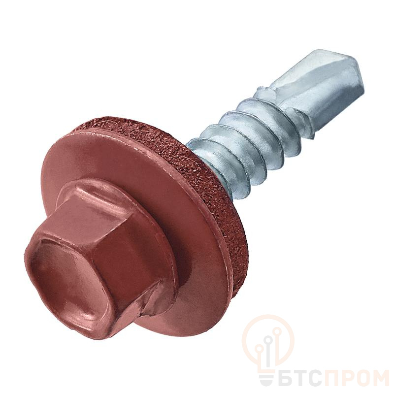 Саморез изготовлен из высококачественной углеродистой стали и покрыт слоем цинка для защиты от коррозии. Головка самореза окрашена в насыщенный цвет RAL 3009 (оксид красный), который гармонично сочетается с популярными цветами металлочерепицы и профнастила, обеспечивая эстетичный внешний вид кровли.