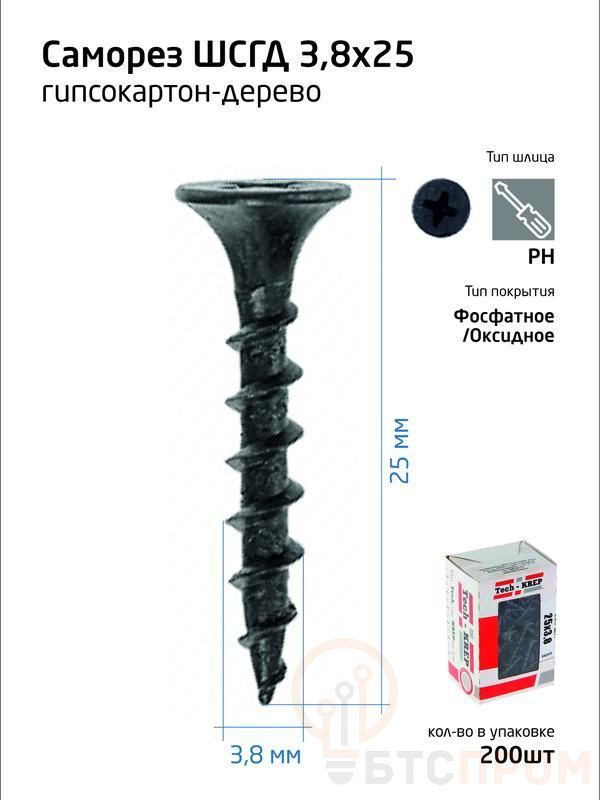 саморез гипсокартон-дерево 3.8х25 (пакет) (уп.30шт) tech-krep/zitar 102370 от BTSprom.by