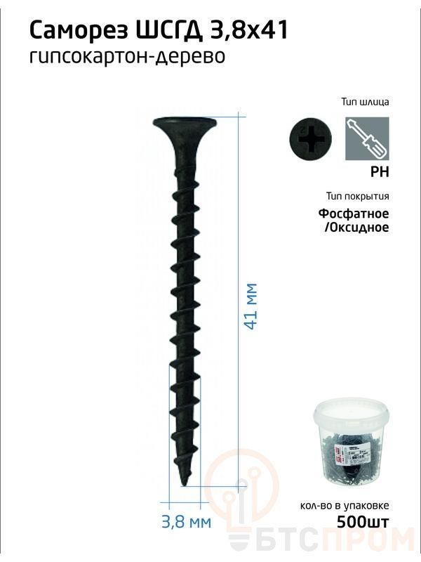 Саморез СГД имеет потайную головку с крестообразным шлицем PH2, резьбу с крупным шагом и острый наконечник. Изготовлен из углеродистой стали с фосфатным или оксидным покрытием черного цвета. Предназначен для крепления гипсокартонных листов (ГКЛ), фанеры, OSB и других листовых материалов к деревянным основаниям. Не рекомендуется использовать для сборки деревянных конструкций (каркасные дома, балочные и стропильные системы) и в комплекте с пластиковыми дюбелями.