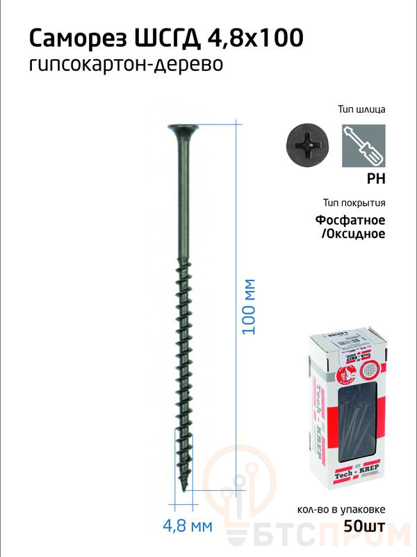 –Саморез гипсокартон-дерево 4.8х100 (коробка) (уп.50шт) Tech-Krep/Zitar 112220