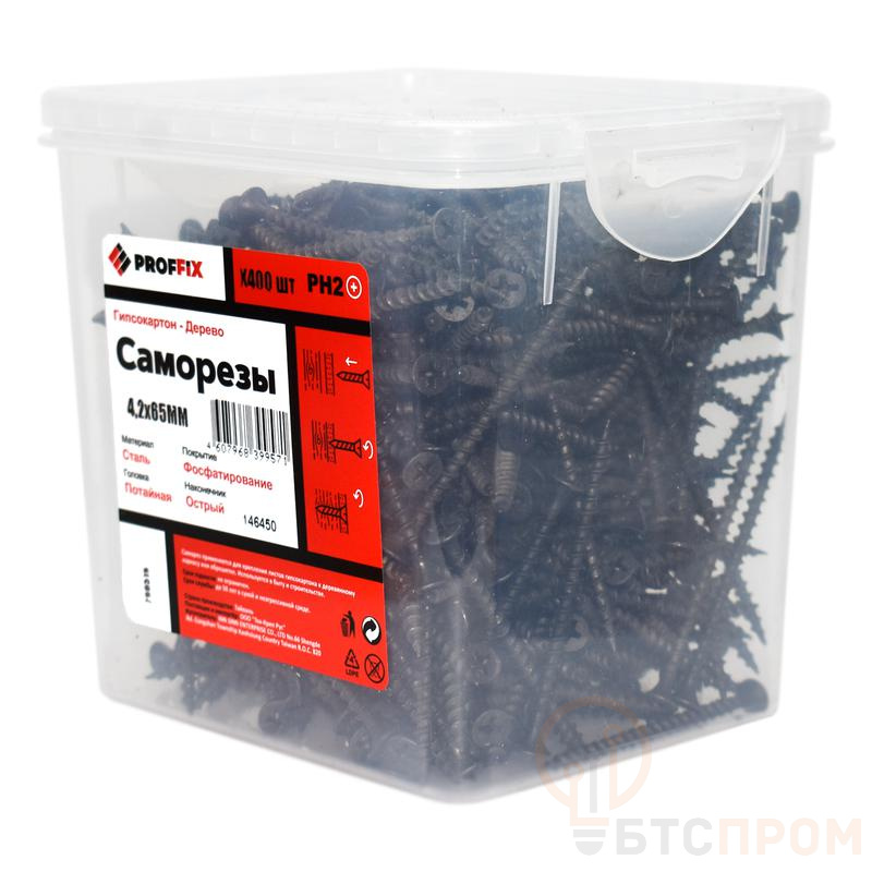 Саморез усиленный гипсокартон-дерево PROFFIX имеет потайную головку с крестообразным шлицем PH2, резьбу с крупным шагом и острый наконечник. Изготовлен из высокопрочной углеродистой стали с оксидным покрытием черного цвета. Предназначен для крепления гипсокартонных листов (ГКЛ), древесноволокнистых плит (ДВП), фанеры, OSB и других листовых материалов к деревянным основаниям. Допускается использовать для соединения элементов деревянных каркасов внутренних ненагруженных перегородок, а также элементов деревянных обрешеток внутри помещений.