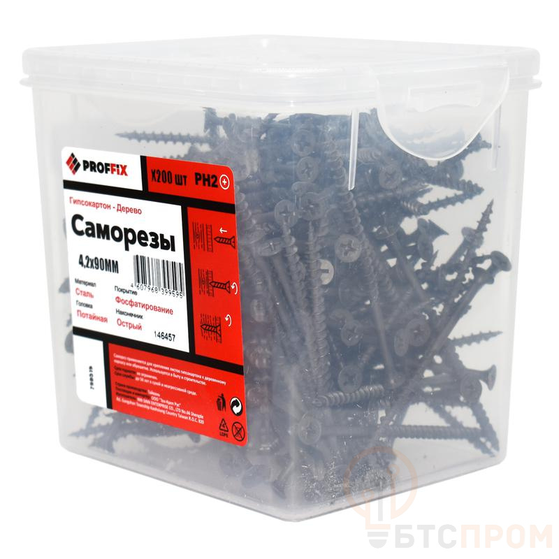 Саморез усиленный гипсокартон-дерево PROFFIX имеет потайную головку с крестообразным шлицем PH2, резьбу с крупным шагом и острый наконечник. Изготовлен из высокопрочной углеродистой стали с оксидным покрытием черного цвета. Предназначен для крепления гипсокартонных листов (ГКЛ), древесноволокнистых плит (ДВП), фанеры, OSB и других листовых материалов к деревянным основаниям. Допускается использовать для соединения элементов деревянных каркасов внутренних ненагруженных перегородок, а также элементов деревянных обрешеток внутри помещений.