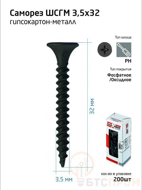 Саморез гипсокартон-металл 3.5х32 (коробка) (уп.200шт) Tech-Krep/Zitar 102699 фото в каталоге от BTSprom.by