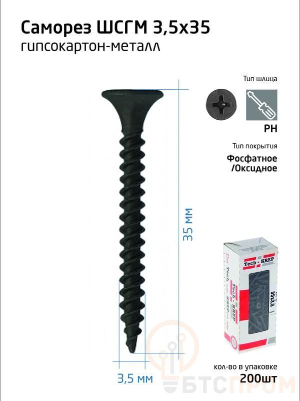 Саморез гипсокартон-металл 3.5х35 (коробка) (уп.200шт) Tech-Krep/Zitar 102130 фото в каталоге от BTSprom.by