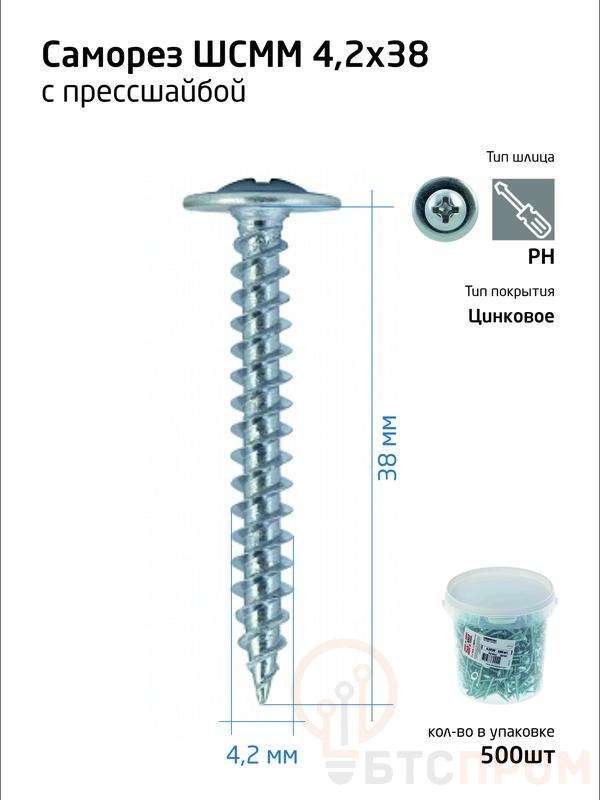 Саморез СММ имеет полусферическую головку с прессшайбой и крестообразным шлицем PH2, полную резьбу с мелким шагом и острый наконечник. Изготовлен из углеродистой стали с антикоррозионным цинковым покрытием. Применяется для крепления металлических элементов, толщина которых не превышает 0,9 мм, между собой и к несущей поверхности без предварительного сверления.