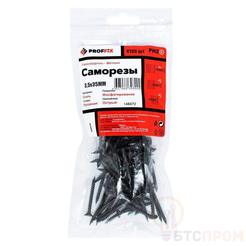 Саморез усиленный гипсокартон-металл PROFFIX имеет потайную головку с крестообразным шлицем PH2, резьбу с мелким шагом и острый наконечник. Изготовлен из высокопрочной углеродистой стали с оксидным покрытием черного цвета. Применяется для потайного крепления гипсокартонных листов (ГКЛ), древесноволокнистых плит (ДВП), фанеры, OSB и других листовых материалов к металлическим основаниям. Допускается использовать для соединения тонкостенных металлических профилей толщиной до 1 мм между собой.