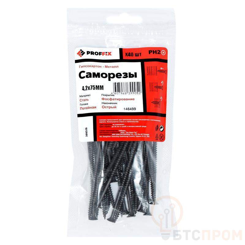 Саморез усиленный гипсокартон-металл PROFFIX имеет потайную головку с крестообразным шлицем PH2, резьбу с мелким шагом и острый наконечник. Изготовлен из высокопрочной углеродистой стали с оксидным покрытием черного цвета. Применяется для потайного крепления гипсокартонных листов (ГКЛ), древесноволокнистых плит (ДВП), фанеры, OSB и других листовых материалов к металлическим основаниям. Допускается использовать для соединения тонкостенных металлических профилей толщиной до 1 мм между собой.