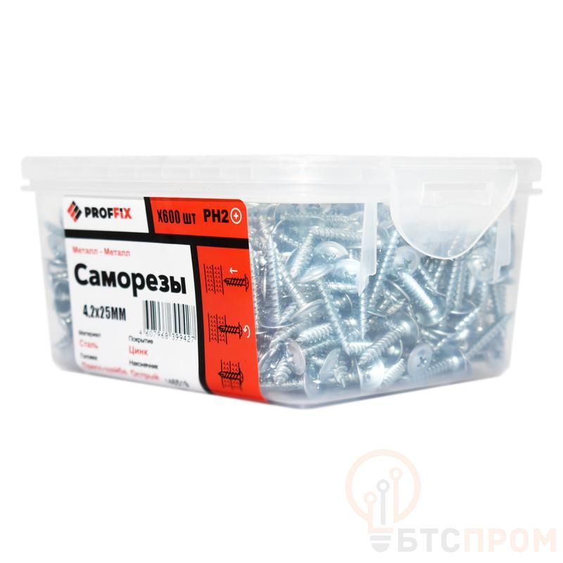 Саморез усиленный PROFFIX имеет полусферическую головку с прессшайбой и крестообразным шлицем PH2, полную резьбу с мелким шагом и острый наконечник. Изготовлен из высокопрочной углеродистой стали с антикоррозионным цинковым покрытием. Применяется для крепления металлических элементов, толщина которых не превышает 1 мм, между собой и к несущей поверхности без предварительного сверления. Допускается применять с пластиковыми дюбелями для установки в кирпичные и бетонные конструкции.