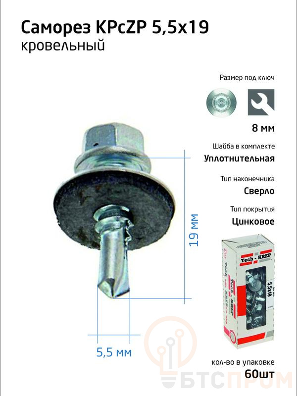 Саморез кровельный KPcZP имеет шестигранную головку, полную резьбу по всей длине стержня, наконечник в виде бура и шайбу с герметизирующей EPDM-прокладкой. Изготовлен из углеродистой стали с антикоррозионным цинковым покрытием. Применяется для крепления кровельных материалов к деревянным обрешеткам и к тонкостенным металлическим конструкциям без предварительного сверления.