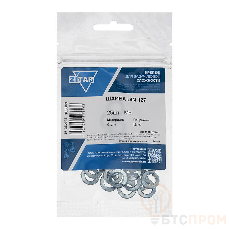 Шайба пружинная М8 DIN 127b оцинк. (уп.25шт) Tech-Krep/Zitar 103049 фото в каталоге от BTSprom.by