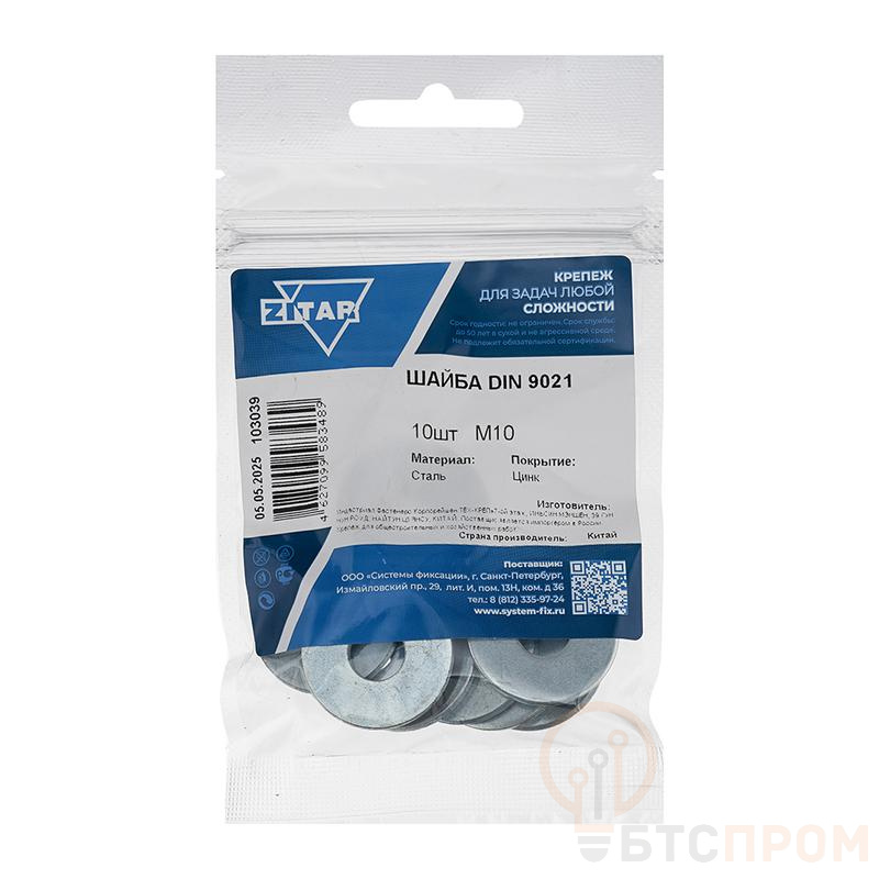 Шайба кузовная М10 DIN 9021 цинк. (пакет) (уп.10шт) Tech-Krep/Zitar 103039 фото в каталоге от BTSprom.by