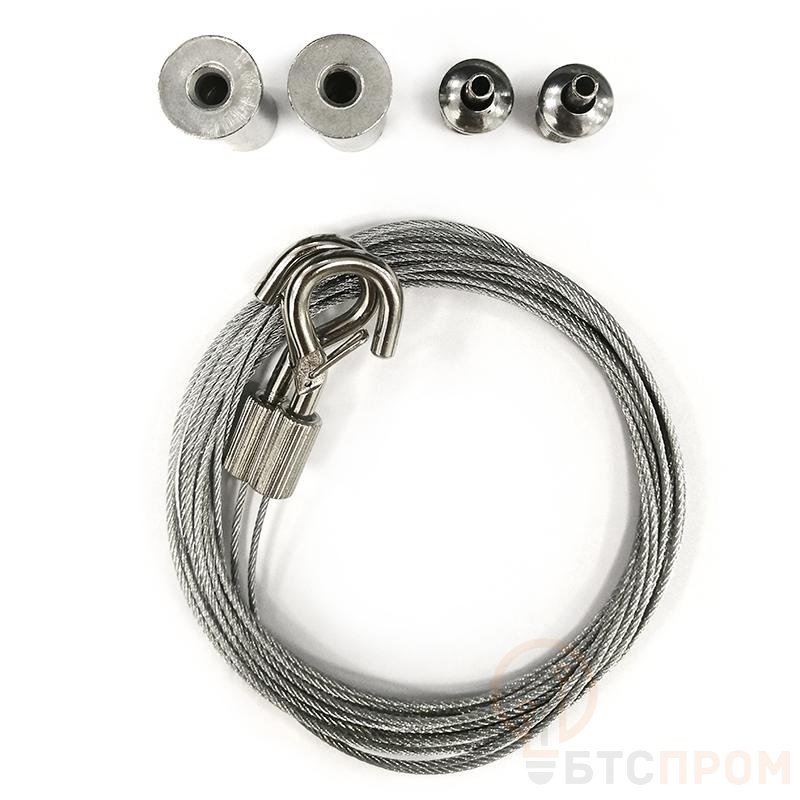 Тросовый подвес используется для монтажа светильников на нужную высоту. Крепится к светильнику с помощью крючка. Трос изготовлен из стальной проволоки, скрученной, с поперечным сечением 1.2 мм, с гальваническим покрытием (оцинковка), без электрической изоляции и контактных элементов. Длина троса 3м. С одной стороны крючок, с другой регулятор.