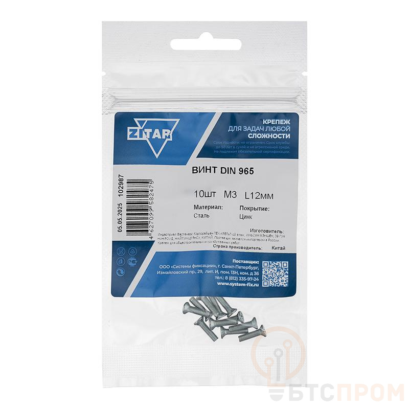 Винт с потайной головкой М3х12 DIN 965 оцинк. (уп.10шт) Tech-Krep/Zitar 102987 фото в каталоге от BTSprom.by