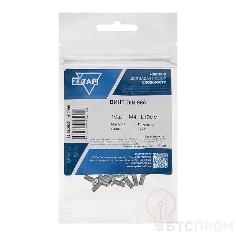 Винт с потайной головкой М4х10 DIN 965 оцинк. (уп.10шт) Tech-Krep/Zitar 102988 фото в каталоге от BTSprom.by