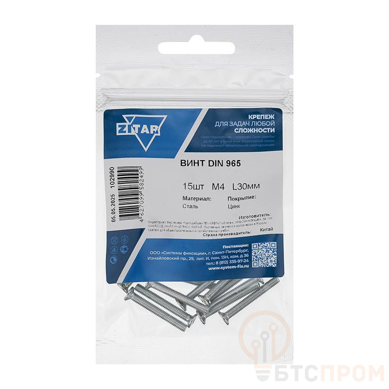 Винт с потайной головкой М4х30 DIN 965 оцинк. (уп.15шт) Tech-Krep/Zitar 102990 фото в каталоге от BTSprom.by