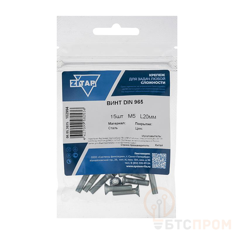 Винт с потайной головкой М5х20 DIN 965 оцинк. (уп.15шт) Tech-Krep/Zitar 102994 фото в каталоге от BTSprom.by