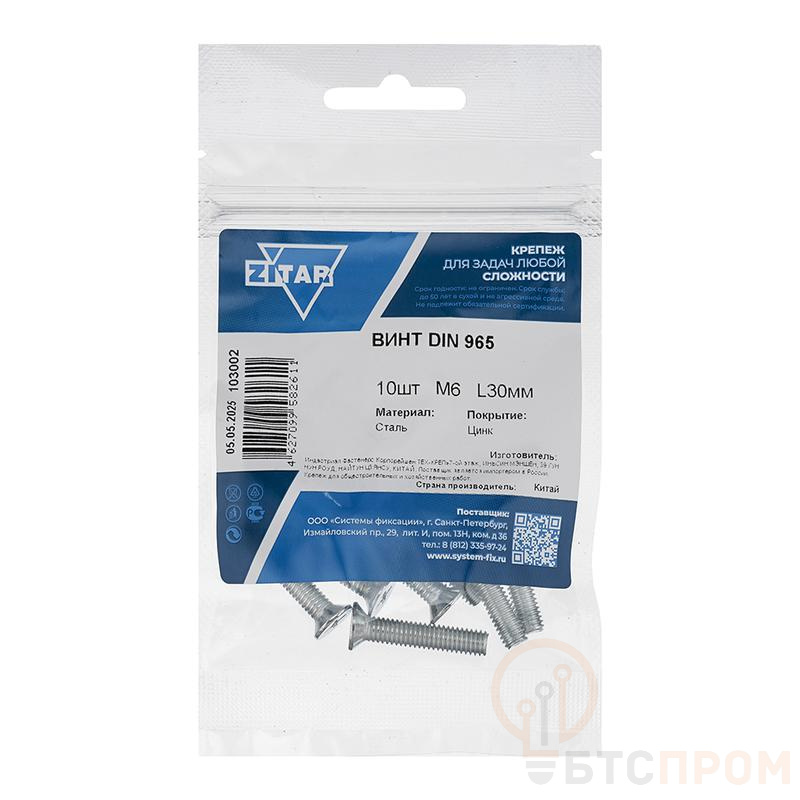 Винт с потайной головкой М6х30 DIN 965 оцинк. (уп.10шт) Tech-Krep/Zitar 103002 фото в каталоге от BTSprom.by