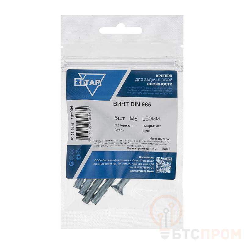 Винт с потайной головкой М6х50 DIN 965 оцинк. (уп.6шт) Tech-Krep/Zitar 103004 фото в каталоге от BTSprom.by