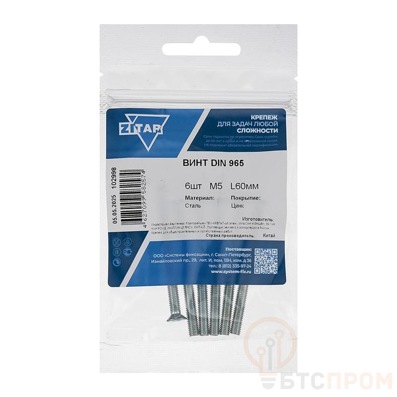 Винт с потайной головкой М5х60 DIN 965 от бренда Tech-Krep/Zitar – это крепежное изделие для создания надежных и эстетичных соединений. Резьба метрического типа М5 и длина 60 мм позволяют скреплять детали средней толщины. Ключевая особенность – потайная (коническая) головка, которая утапливается в материал, обеспечивая идеально ровную поверхность без выступающих элементов.