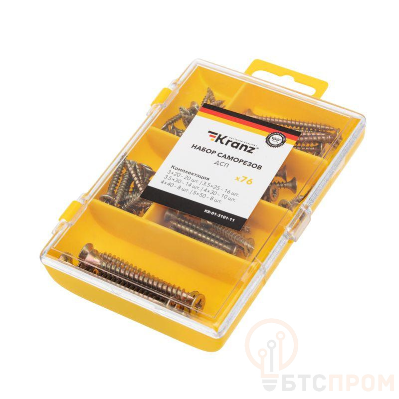 Набор саморезов используется для крепления тонколистового металла, древесно-стружечных и гипсокартонных плит, брусьев, досок, полимерных ламелей к деревянным основаниям без предварительного сверления. В комплексе с пластиковым дюбелем универсальные саморезы DIN 7962 могут использоваться для крепления к бетону, кирпичу, шлакоблоку. Саморезы изготовлены из стали, покрытой желтым цинком, что обеспечивает изделиям высокую прочность и долговечность. Небольшой набор состоит из 76 саморезов для ДСП, которых хватит для выполнения базовых задач. Поставляется в пластиковом органайзере, который помогает не только удобно хранить изделия, но и быстро находить крепеж нужного размера. Органайзер может в дальнейшем использоваться для хранения других крепежных элементов. Набор состоит из саморезов 3,0?20 (20 шт.), 3,5?25 (16 шт.), 3,5?30 (14 шт.), 4,0?30 (10 шт.), 4,0?40 (8 шт.), 5,0?50 (8 шт.).