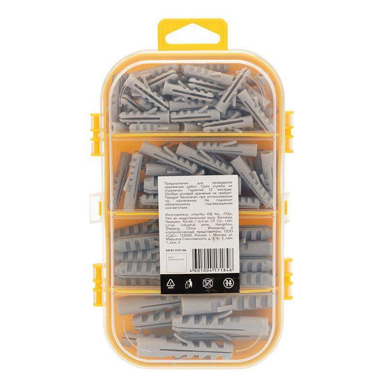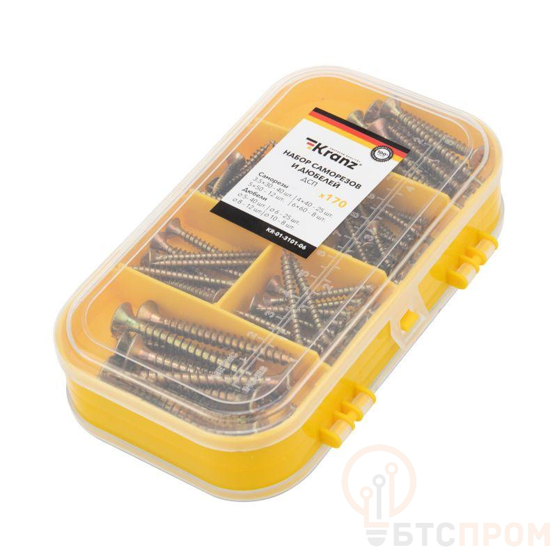 Набор саморезов по дереву DIN 7962 и распорных дюбелей используется для крепления тонколистового металла, древесно-стружечных и гипсокартонных плит, брусьев, досок, полимерных ламелей ко всем видам полнотелых оснований (бетону, железобетону, кирпичу и пр.). Также может использоваться для скрепления деревянных оснований между собой. При закручивании самореза тело дюбеля расширяется по всему диаметру и длине, что усиливает распорное давление, позволяя выдерживать увеличенные нагрузки. Саморезы изготовлены из стали, покрытой желтым цинком, что обеспечивает изделиям высокую прочность и долговечность. Набор состоит из 170 крепежных элементов, которых хватит для выполнения множество задач, поставляется в пластиковом органайзере, который помогает не только удобно хранить изделия, но и быстро находить крепеж нужного размера. Органайзер может в дальнейшем использоваться для хранения других крепежных элементов. Состав набора: – саморезы для ДСП 3,5?30 (40 шт.); 4,0?40 (25 шт.); 5,0?50 (12 шт.); 6,0?60 (8 шт.); – дюбели ?5 (40 шт.); ?6 (25 шт.); ?8 (12 шт.); ?10 (8 шт.).