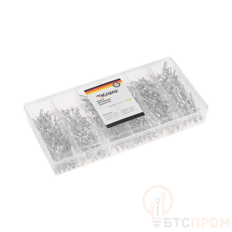 Набор вытяжных заклепок предназначен для использования совместно с заклепочником для соединения тонких деталей и сборки различных конструкций, доступ к которым возможен только с одной стороны. Заклепки подходят для скрепления предметов из металла, древесины, пластмассы, кожи, обеспечивают эстетичное соединение. Штифт заклепки изготовлен из высококачественного алюминия, а втулка – из стали, благодаря прочным материалам заклепки обладают высокой прочностью и долговечностью. Набор состоит из 320 крепежных элементов, которых хватит для выполнения множества задач. Поставляется в пластиковом органайзере, который помогает не только удобно хранить изделия, но и быстро находить крепеж нужного размера. Органайзер может в дальнейшем использоваться для хранения других крепежных элементов. Набор состоит из заклепок 2,4x5,5 мм (80 шт.); 3,2x3,2 мм (60 шт.); 3,2x6 мм (50 шт.); 3,2x7,5 мм (60 шт.); 4,0x8 мм (40 шт.); 4,8x8 мм (30 шт.).