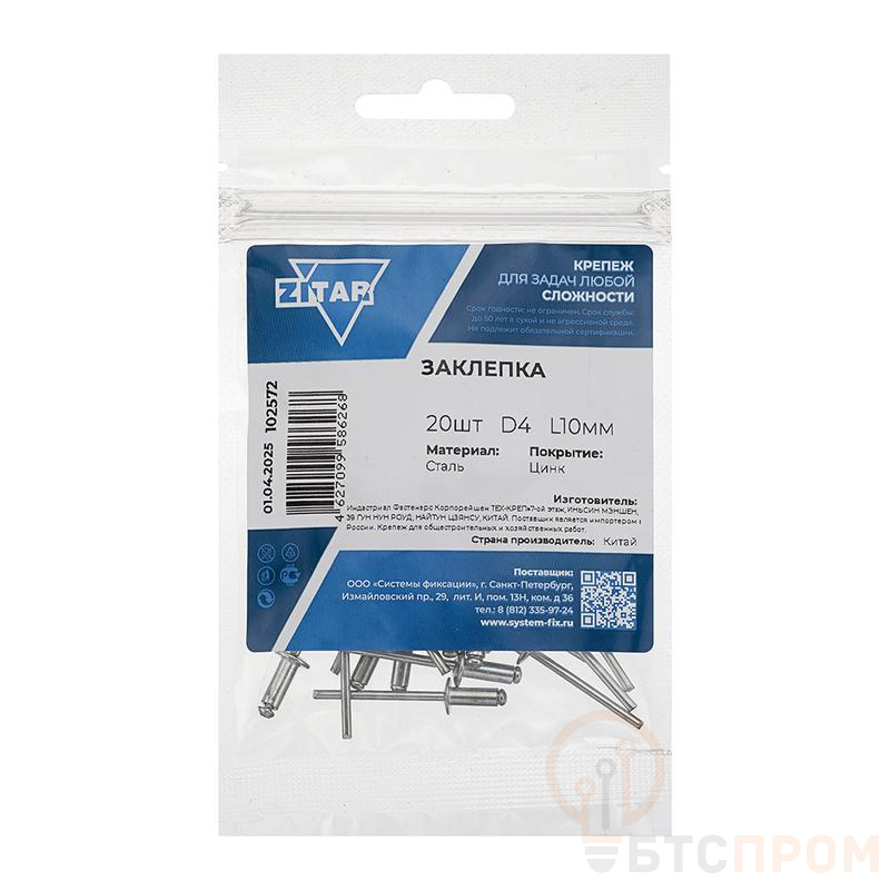Заклепка 4.0х10 (пакет) (уп.20шт) Tech-Krep/Zitar 102572 фото в каталоге от BTSprom.by