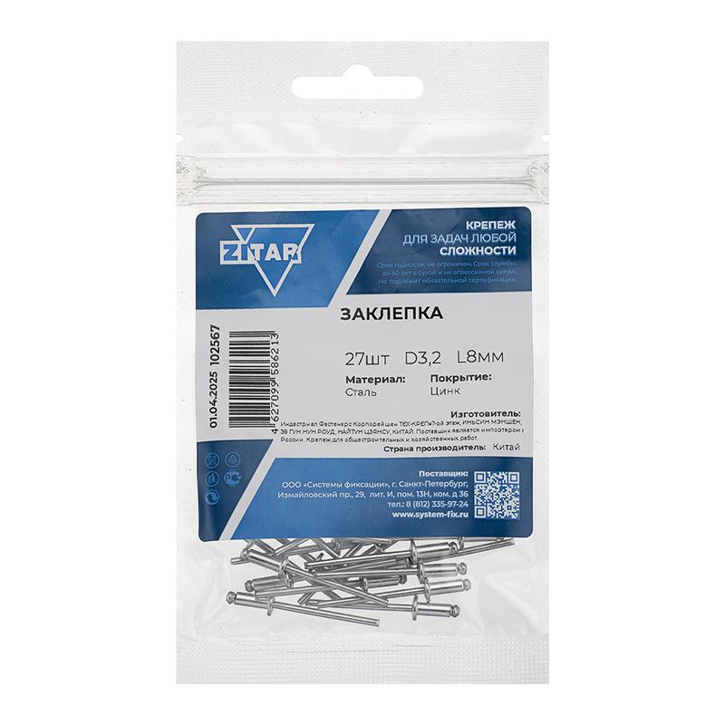 Заклепка 3.2х8 (пакет) (уп.27шт) Tech-Krep/Zitar 102567 фото в каталоге от BTSprom.by