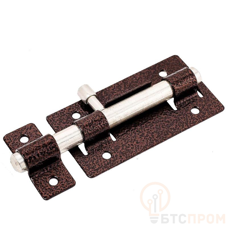 Засов Киров Секрет ЗД-01антик медь круглый (20), , Засов накладной для деревянных и металлических дверей. Материал - сталь, полимерное покрытие. Габариты корпуса - 115х63 мм, 4 крепежных отверстия. Круглый ригель диаметром 13 мм с вылетом 30 мм. В комплекте ответная планка.