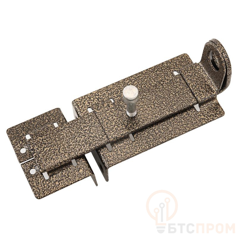 Засов накладной с проушиной для деревянных и металлических дверей. Материал - сталь, полимерное покрытие. Габариты корпуса - 100х65 мм, 4 крепежных отверстия. Плоский ригель 4х30 мм с вылетом 35 мм. В комплекте угловая ответная планка.