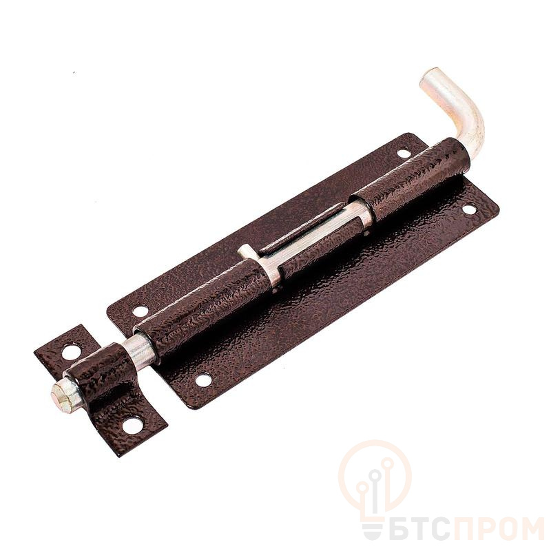 Засов накладной для металлических дверей. Материал - сталь, полимерное покрытие. Габариты корпуса - 65х180 мм, 4 крепежных отверстия. Г-образный цилиндрический ригель диаметром 13 мм с вылетом 55 мм. В комплекте ответная планка 65х25 мм.