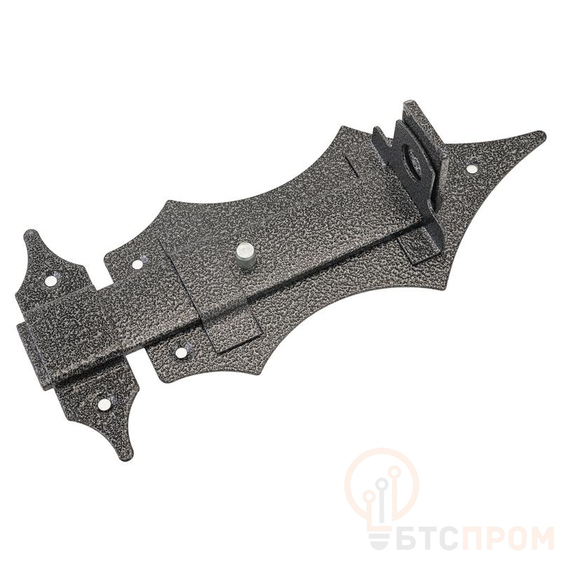 Засов накладной с проушиной фигурный для металлических дверей. Материал - сталь, полимерное покрытие. Габариты корпуса - 65х180 мм, 4 крепежных отверстия. Плоский ригель с вылетом 40 мм. В комплекте ответная планка 110х30 мм.