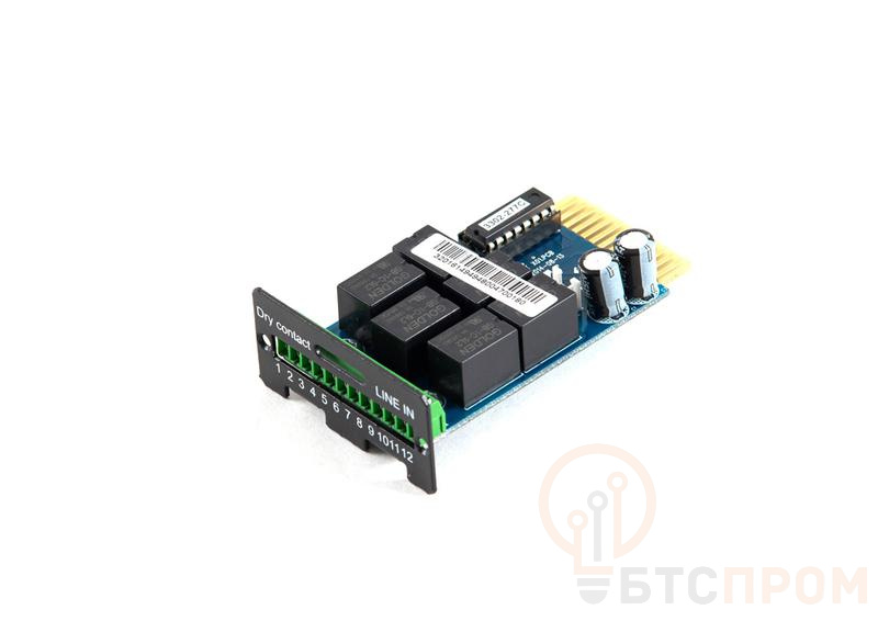 Релейный модуль для SKAT-UPS 1000 RACK, SKAT-UPS 1000 RACK+2x9Ah, SKAT-UPS 1000 исп.V RACK, SKAT-UPS 2000 RACK, SKAT-UPS 2000 RACK+4X9Ah, SKAT-UPS 3000 RACK, SKAT-UPS 3000 RACK+6x9Ah. Модуль преобразует внутренние сигналы ИБП в формат «сухой контакт реле», обеспечивает возможность дистанционного отключения ИБП и внешнего мониторинга состояния электросети и ИБП по шести основным параметрам. Тип контактов — клеммная колодка. Количество клемм — 12.
