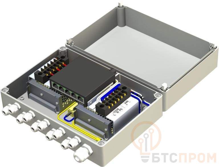Узел системы видеонаблюдения УСВ-24 предназначен для питания до 4-х IP-устройств (видеокамер, контроллеров сигнализации, доступа и т.п.), и приемо-передачи данных на пост наблюдения по сети Ethernet