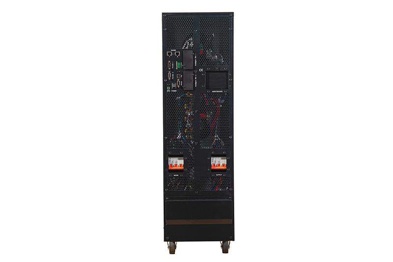 380 В, 20 кВА (18 кВт), Online, 3-фазный вход–3-фазный выход, синусоидальная форма выходного напряжения, длительный резерв, световая и звуковая индикация режимов работы, ЖК-дисплей, необходимое кол-во АКБ для работы — 16/18/20 шт., горячая замена АКБ, холодный старт, ёмкость — 40–250 Ач. Ток заряда АКБ — 10 А, стабилизация выходной частоты 50 Гц при входной 45–55 Гц. Наращивание мощности или резервирования параллельным включением до 4 устройств. Дистанционный мониторинг по RS 232, USB, 2 порта для платы релейного интерфейса или SNMP-модуля CX 504, коммуникационный порт типа "сухой контакт". Функция удалённого аварийного отключения выходного напряжения (EPO). Напольная установка. Уникальный ИБП для длительного резерва всего объекта. Время автономной работы зависит только от ёмкости АКБ.
