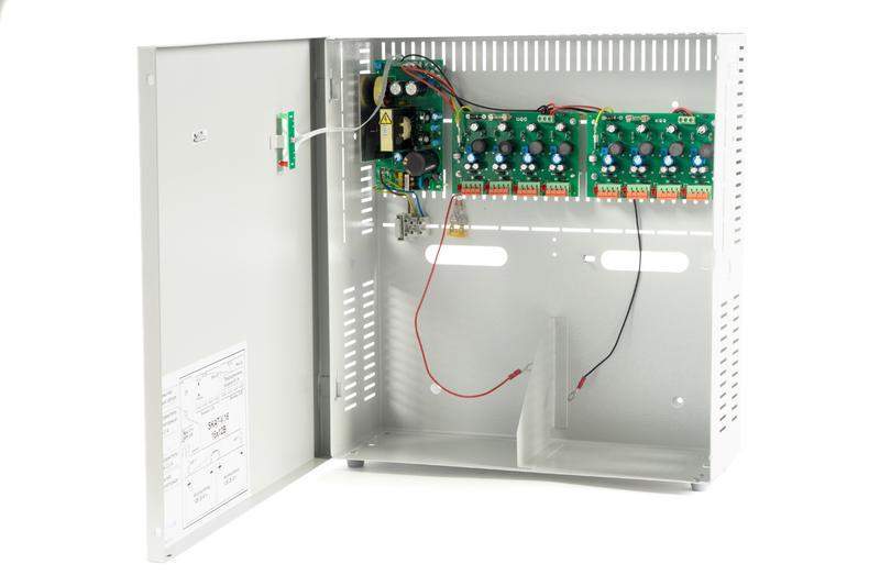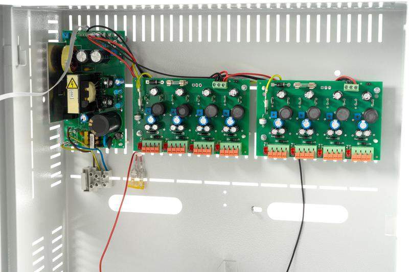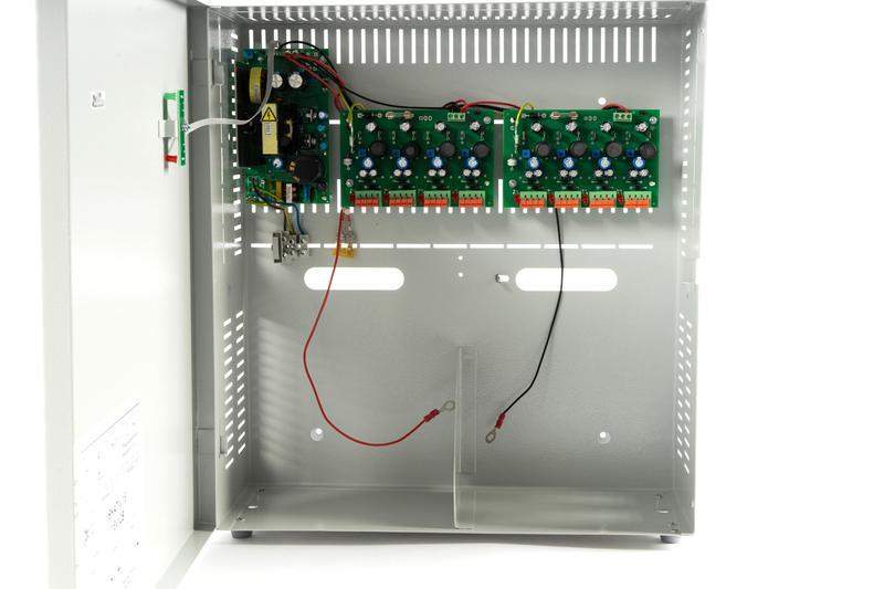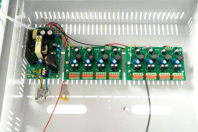 16 выходов по 0,5 А или 8 выходов по 1 А, максимальный ток по всем выходам — 6 А, необходима установка 2 АКБ 26 Ач. Независимая регулировка выходного напряжения по каналам, фильтрация помех по каждому каналу, защита от КЗ и перегрузки по каждому каналу.
