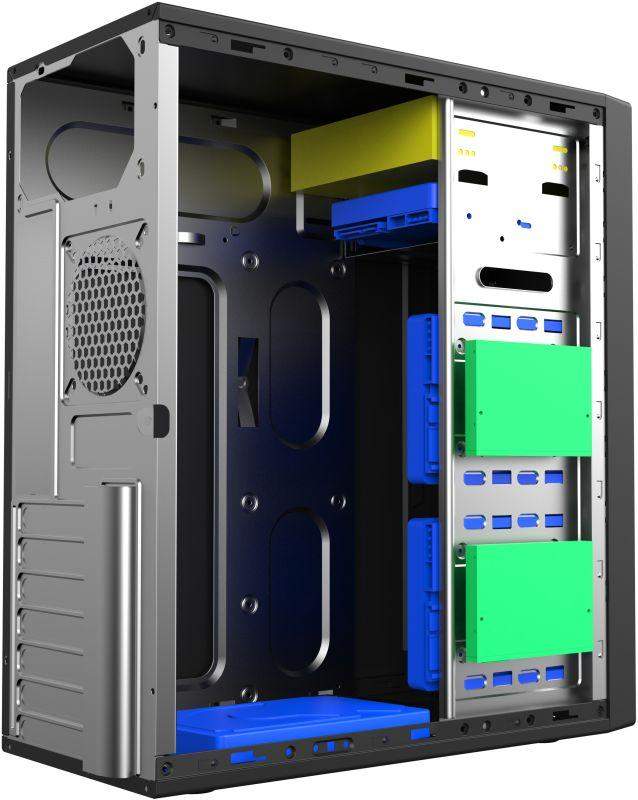 Важным преимуществом является комплектация встроенным блоком питания мощностью 450 Ватт, что избавляет от необходимости его отдельной покупки и обеспечивает стабильное энергоснабжение компонентов системы начального и среднего уровня. На лицевой панели расположены четыре порта USB 2.0 для удобного подключения периферийных устройств, а также аудиовыходы High Definition Audio.