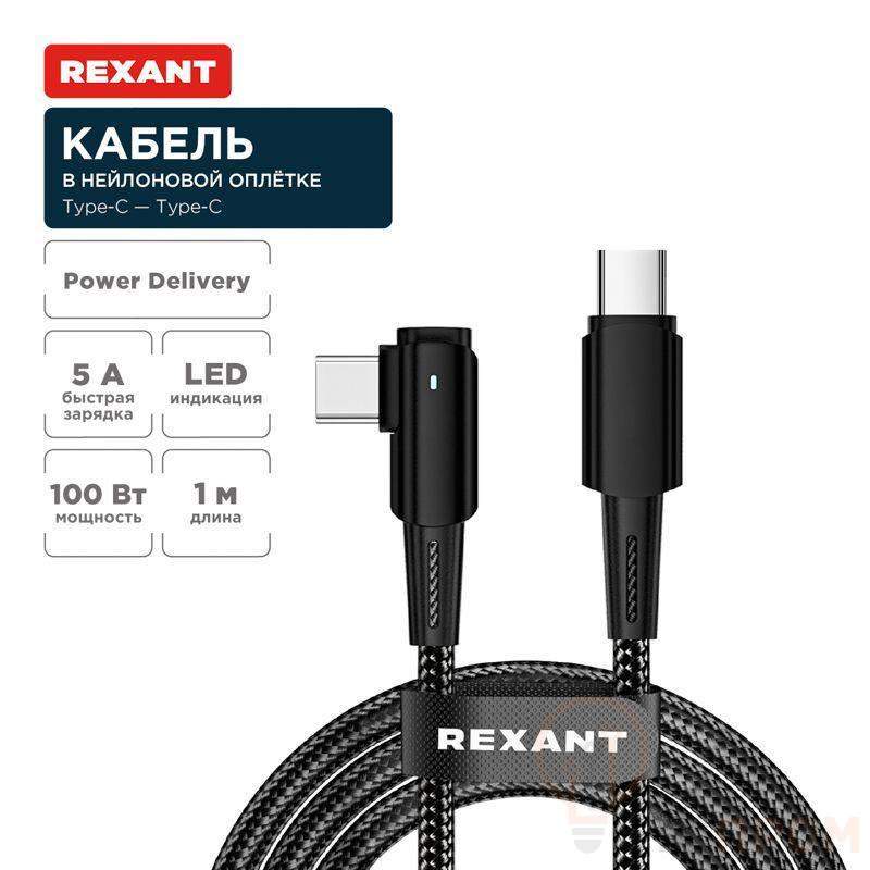 Кабель Type-C-Type-C 5А 100Вт 1м черн. нейлон. оплетка с угловым штекером и световой индикацией Rexant 18-7070