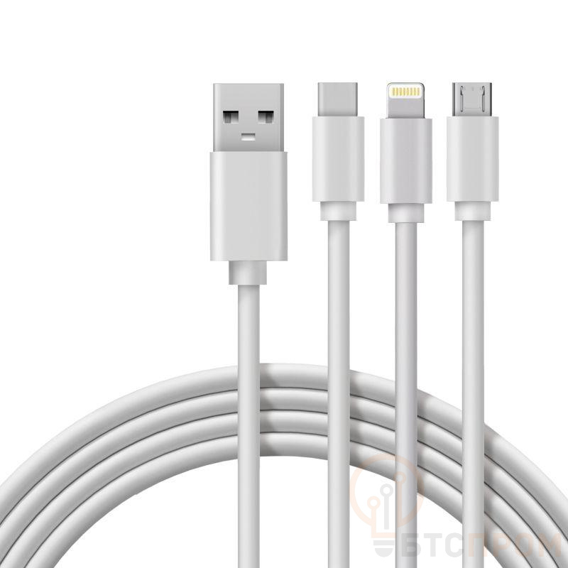 Универсальный кабель 3 в 1 предназначен для зарядки мобильных устройств, а также их синхронизации с ПК или ноутбуками. Кабель оснащен разъемами Type-C, Lightning и micro USB. Совместим c устройствами, имеющими соответствующие порты. Оболочка из ПВХ надежно предохраняет кабель от механических повреждений. Кабель имеет силу тока 3 А для разъема Type-C, силу тока 2 A для разъема Lightning, силу тока 2,4 A для разъема micro USB. Длина кабеля составляет 1 м, что позволяет заряжать устройства и передавать данные на комфортном расстоянии для пользователя.