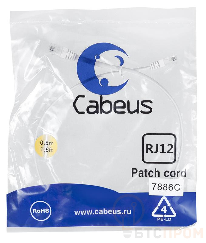 –Патч-корд телефонный PC-TEL-RJ12-0.5m 2х6р4с PVC 0.5м бел. Cabeus 7886c