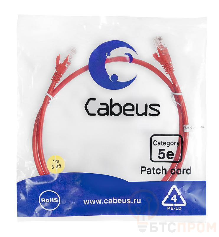 Патч-корд U/UTP кат.5E PC-UTP-RJ45-Cat.5e-1m-RD-LSZH 2xRJ45/8p8c неэкранир. LSZH 1м красн. Cabeus 9513c