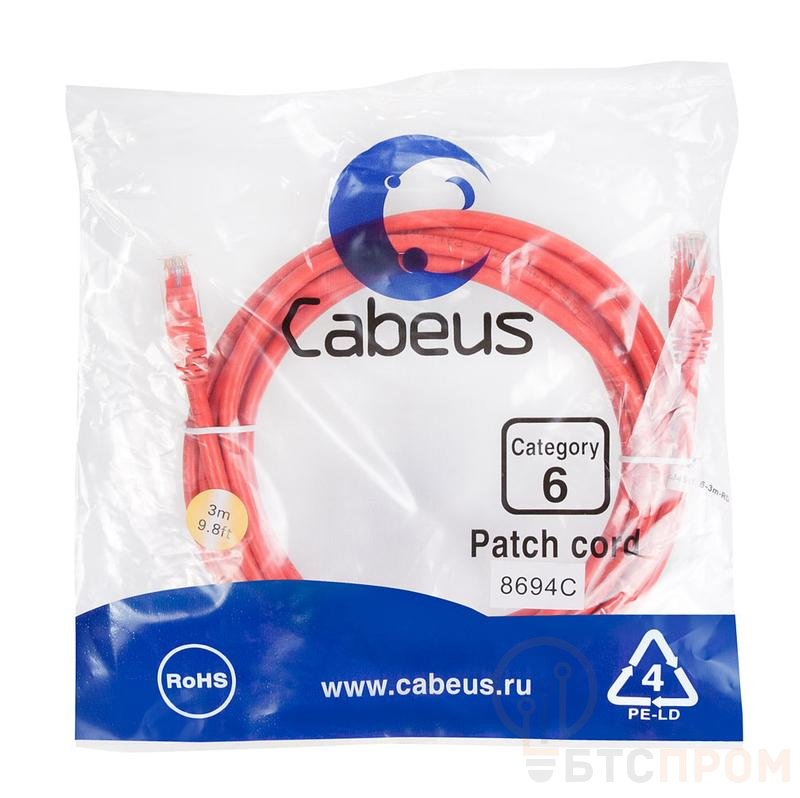 Патч-корд U/UTP кат.6 PC-UTP-RJ45-Cat.6-3m-RD 2xRJ45/8p8c неэкранир. PVC 3м красн. Cabeus 8694c фото в каталоге от BTSprom.by