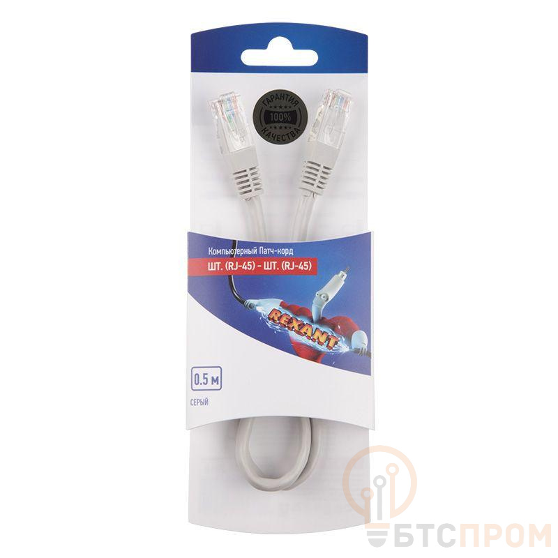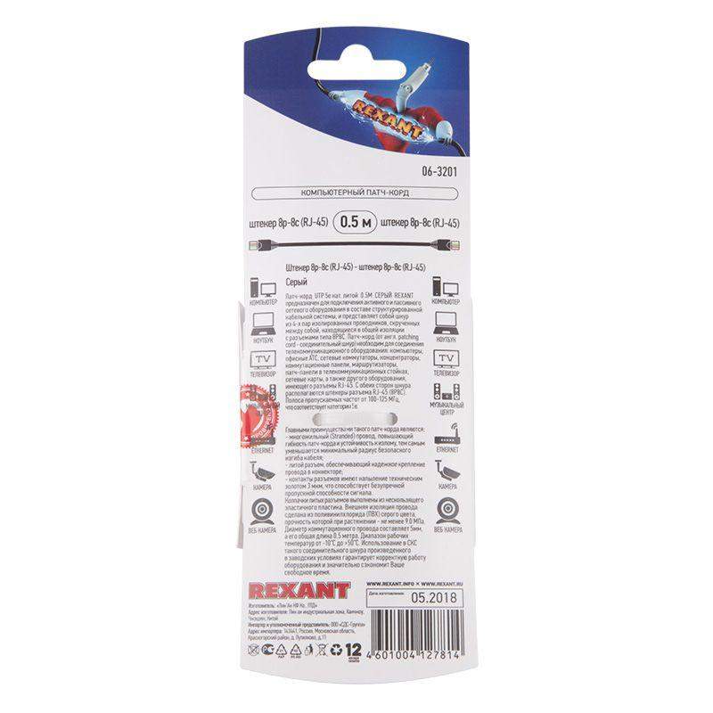 Патч-корд UTP 5e кат. литой 0.5М СЕРЫЙ REхANT предназначен для подключения активного и пассивного сетевого оборудования в составе структурированной кабельной системы, и представляет собой шнур из 4-х пар изолированных проводников, скрученных между собой, находящиеся в общей изоляции с разъемами типа 8P8C. Патч-корд (от англ. patching cord — соединительный шнур) необходим для соединения телекоммуникационного оборудования: компьютеры, офисные АТС, сетевые коммутаторы, концентраторы, коммутационные панели, маршрутизаторы, патч-панели в телекоммуникационных стойках, сетевые карты, а также другого оборудования, имеющего разъемы RJ-45. С обеих сторон шнура располагаются штекеры разъема RJ-45 (8P8C). Полоса пропускаемых частот от 100-125 МГц, что соответствует категории 5е. Главными преимуществами такого патч-корда являются: - многожильный (Stranded) провод, повышающий гибкость патч-корда и устойчивость к излому, тем самым уменьшается минимальный радиус безопасного изгиба кабеля; - литой разъем, обеспечивающий надежное крепление провода в коннекторе; - контакты разъемов имеют напыление техническим золотом 3 мкм, что способствует безупречной пропускной способности сигнала. Колпачки литых разъемов выполнены из нескользящего эластичного пластика. Внешняя изоляция провода сделана из поливинилхлорида (ПВХ) серого цвета, прочность которой при растяжении - не менее 9.0 МПа. Диаметр коммутационного провода составляет 5мм, а его общая длина 0.5 метра. Диапазон рабочих температур от -10? до +50?. Использование в СКС такого соединительного шнура произведенного в заводских условиях гарантирует корректную работу оборудования и значительно сэкономит Ваше свободное время.